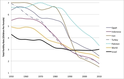 Just as remarkable is that fertility in most of the Muslim world has fallen below Israel’s, while the fertility of Israeli Arabs and Arabs in Judea and Samaria has converged on the Jewish fertility rate in Israel. At present fertility rates there is no risk that a non-Jewish majority will emerge between the Mediterranean and the Jordan River. Not only has the so-called population time bomb disappeared in Israel; in large parts of the Muslim world, fertility has fallen below the Jewish fertility rate in Israel.