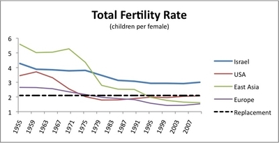 Israel’s fertility rate of three children per Jewish woman is higher than that of any other country in the developed world, and the only fertility rate substantially above replacement. Only the United States among the world’s industrial nations has a fertility rate around the replacement level of 2.1; Europe and East Asia are headed for eventual population decline with fertility of just 1.5 children per woman. Israeli women, by contrast, have three children on average; non-Haredi Jewish women have an average of 2.6.