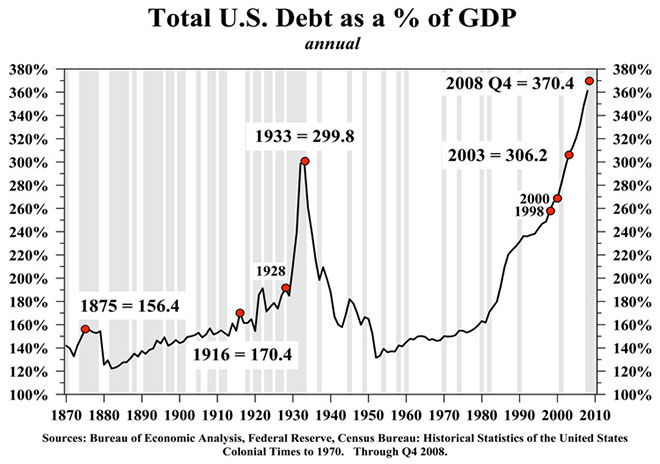 Although debt started to rise in 1880, the true boom started in the 1890s and continued steadily to the recession in 1920. It continued into 1929, when the ratio peaked at 195 percent. At that time, the U.S. government was minimally borrowed; the majority of debt was private. When the economy declined by thirty percent, the ratio rocketed to reach nearly 300 percent in 1933. The rate subsequently fell to 160 percent by the time of Pearl Harbor, when government debt began to rise to pay for the enormous war effort. Output, however, rose almost as fast before collapsing once again to below 140 percent in 1949. In all, the debt destroyed between 1929 and 1950 was $100 billion, just under the GDP in 1929.