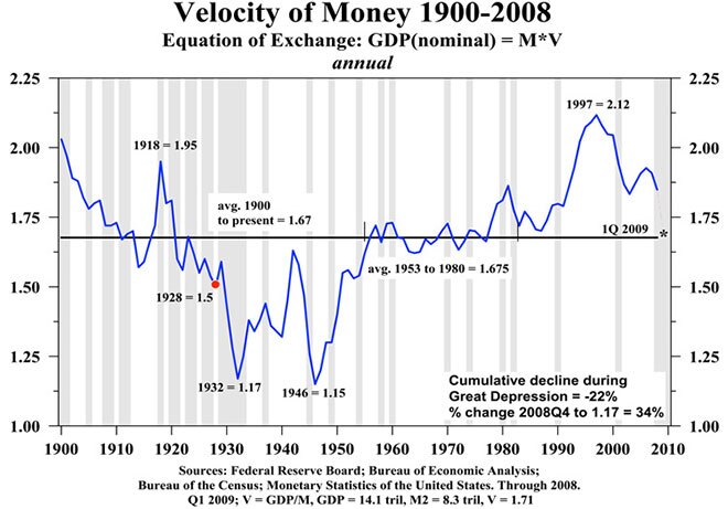The quantity of money theory holds that money supply, multiplied by the rate of circulation (the velocity), equals the nominal GDP. As the third diagram shows, regeneration of the GDP will be very difficult to achieve in a recession until the velocity becomes positive once more.