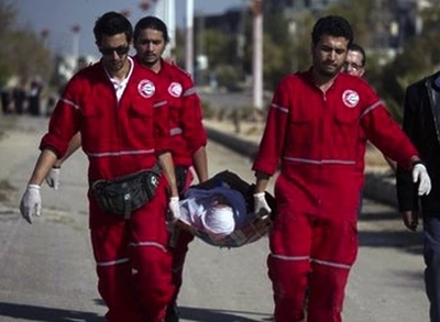 A Syrian citizen from Moadamiya, too sick to walk, and had to be assisted by Red Crescent workers. (Photo: BBC News) |