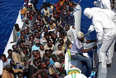 Members of the Italian Coast Guard rescue dozens of migrants crowded onto an inflatable dinghy off the coast of Libya in April. (Photo: AP) |