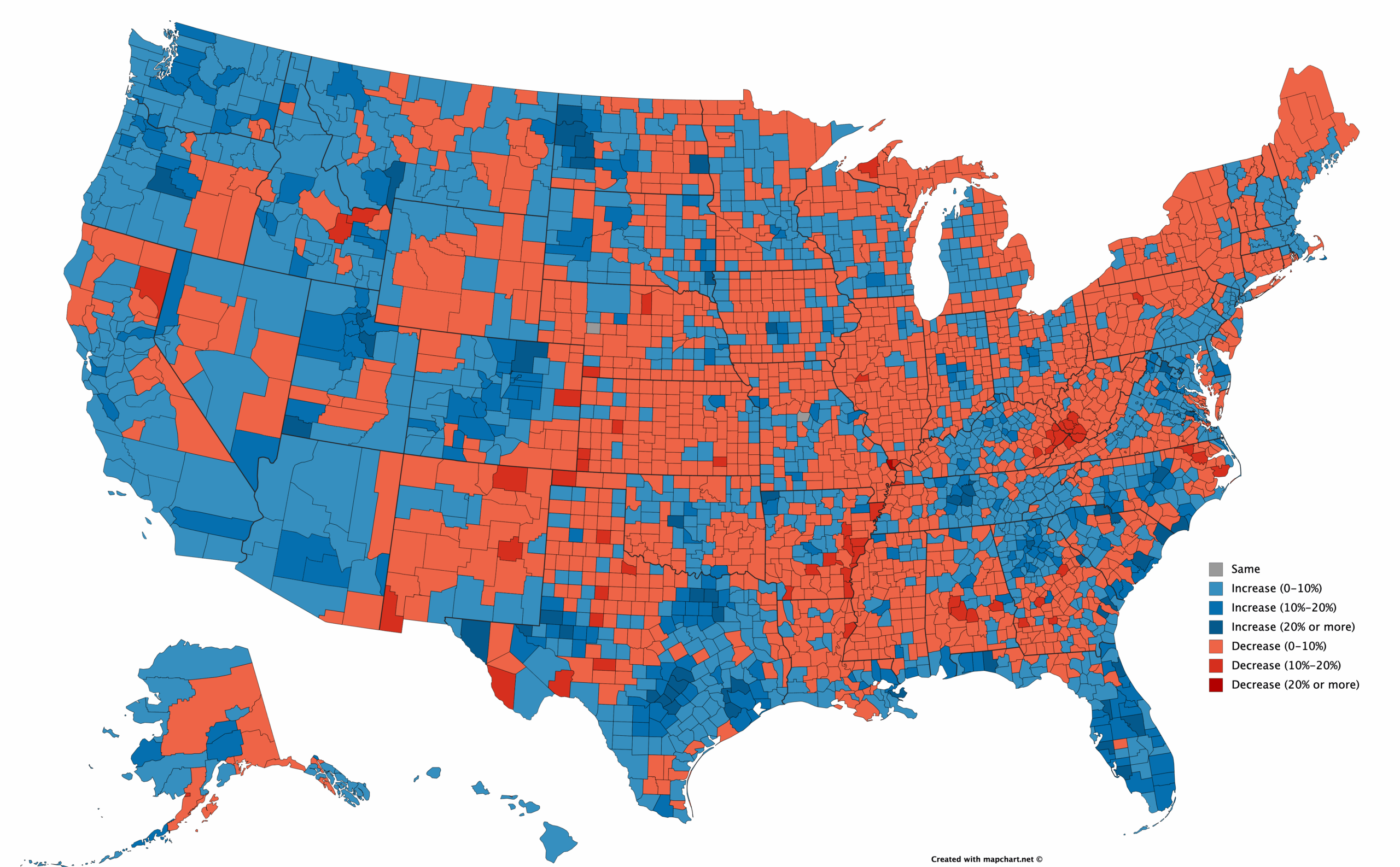 In 2016, the Republican candidate Donald Trump again won the two-party vote among whites by 20 percent and lost to Hillary Clinton among the minority groups by the same 60 percent. But this time around, whites only comprised about 72 percent of the two-party vote, and Democrat Hillary Clinton won a narrow popular vote victory of just over two percent.