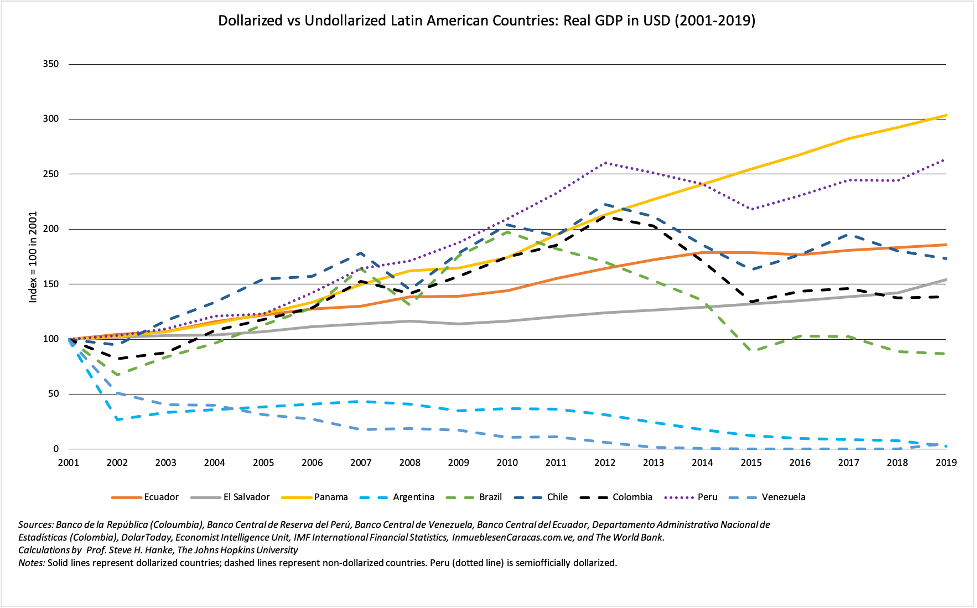 In addition to lower and less variable inflation rates, officially dollarized countries produce higher and more-stable economic growth rates than comparable countries with central banks that produce domestic currencies. Dollarization is, therefore, desirable. The figure above shows the normalized values of real gross domestic product (GDP) in terms of U.S. dollars between 2001 (index value = 100) and 2019 for nine Latin American countries. Three—Panama, Ecuador, and El Salvador—are officially dollarized, while Peru is semiofficially dollarized. In the three officially dollarized countries, real GDP growth has been more stable and generally superior to growth in the countries that issue their own domestic currencies. While Peru’s growth has only been surpassed by Panama’s, it is less stable than growth in the three officially dollarized countries. The sharp changes in terms of trade, which were associated with the commodity cycle, affected the volatility of real GDP measured in U.S. dollar terms much more in the countries that issued their own domestic currencies than it did in those that were officially dollarized.
