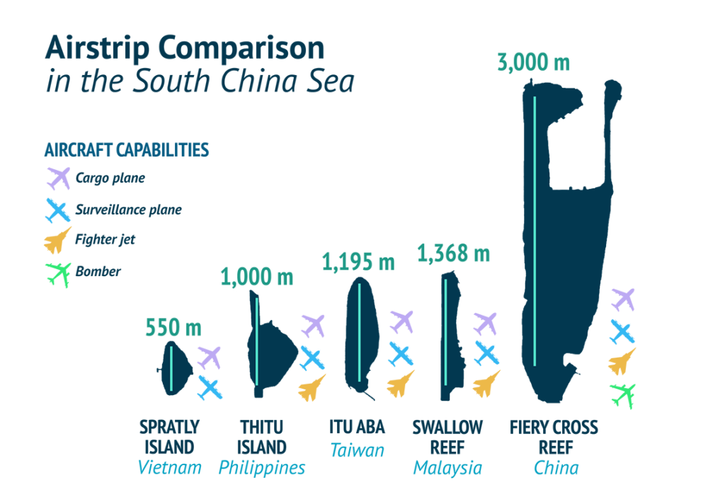 See the comparison of runway sizes of some of the islands compared to one of four of China’s illegally occupied islands—Fiery Cross Reef located in the Spratly Islands area.
