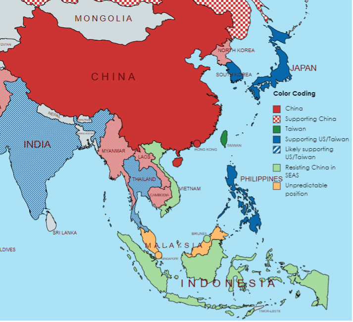 Mainly due to secret security agreements or heavy economic leverage, the following countries would not support Taiwan and probably not back the US and partners in a crisis: Myanmar, Cambodia, Laos, and possibly Timor-Leste. These countries could end up being allies of China as hostilities developed and they are forced to choose sides.