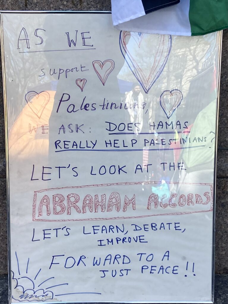 - I presented them with my nicely framed poster board: “As we support (heart, heart) Palestinians, we ask: Does Hamas really help Palestinians? Let’s look at the Abraham Accords — learn, debate, improve. Forward to a just peace!”