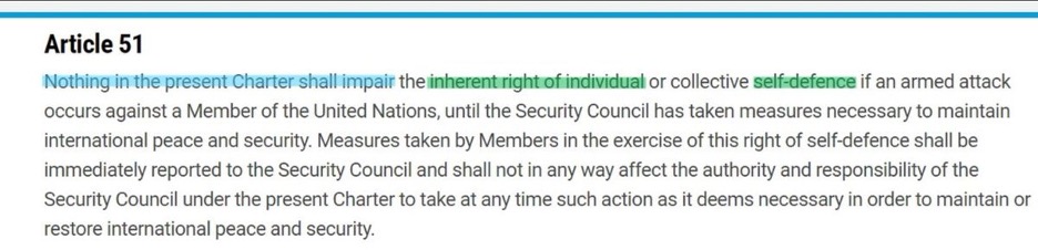 Hi Piers. Retired military lawyer & current int’l law prof here again with another pro tip for you. You are of course correct to note @Israel has the “right to defend itself after the Oct7 atrocity.” That’s not just your opinion, though. In case you’re curious where that right comes from, it’s reflected in Art. 51 of @UN Charter – which I’ve attached for ease of reference if you’re interested in seeing it for yourself. (Image 1)