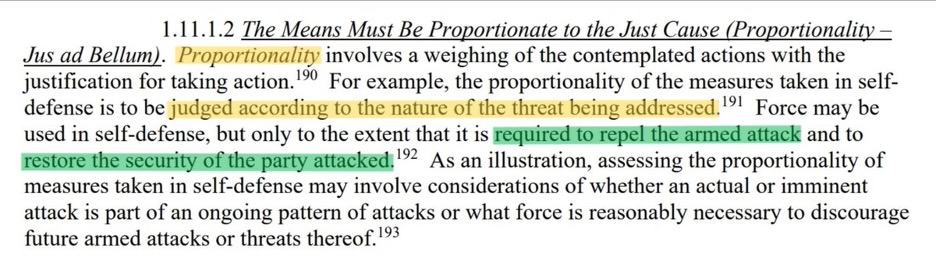 There is no authoritative consensus view on exactly what “proportionality” requires, but I’ve attached two useful examples here, again for ease of reference. One is from the International Law Association (@ILA official) Final Report on Aggression and the Use of Force published in 2018 (Image 2). Second is excerpt from @DeptofDefense Law of War Manual (Image 3).