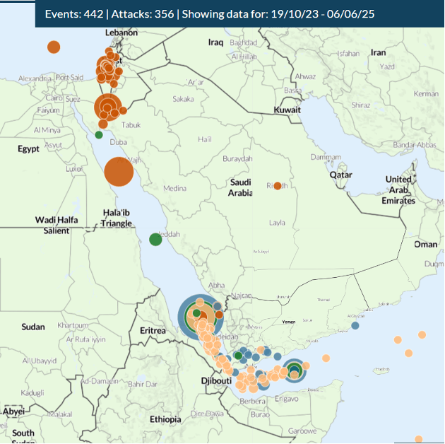 The map nearby shows the attacks from October 19, 2023 through June 6, 2025 from the Armed Conflict Location & Event Data (ACLED) set. Between April 29,2025 and May 29, 2025 (after the US-Houthi ceasefire), the Houthis attacked Israel 20 times.